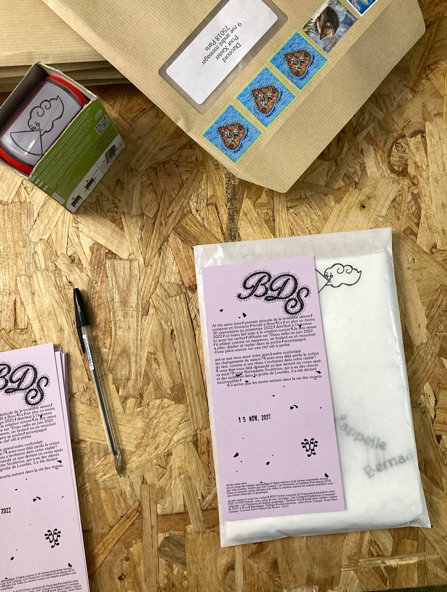 livret sérigraphié, ruban et touche de parfum à la lavande